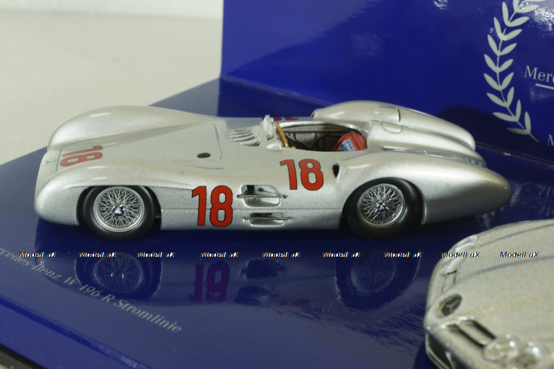 Mercedes 300 SLR Stromline (W196) 1954 silver and Mercedes SLR McLaren (C199) 2003 Silver, 50 years Mercedes Magazine, Set Minichamps 1:43